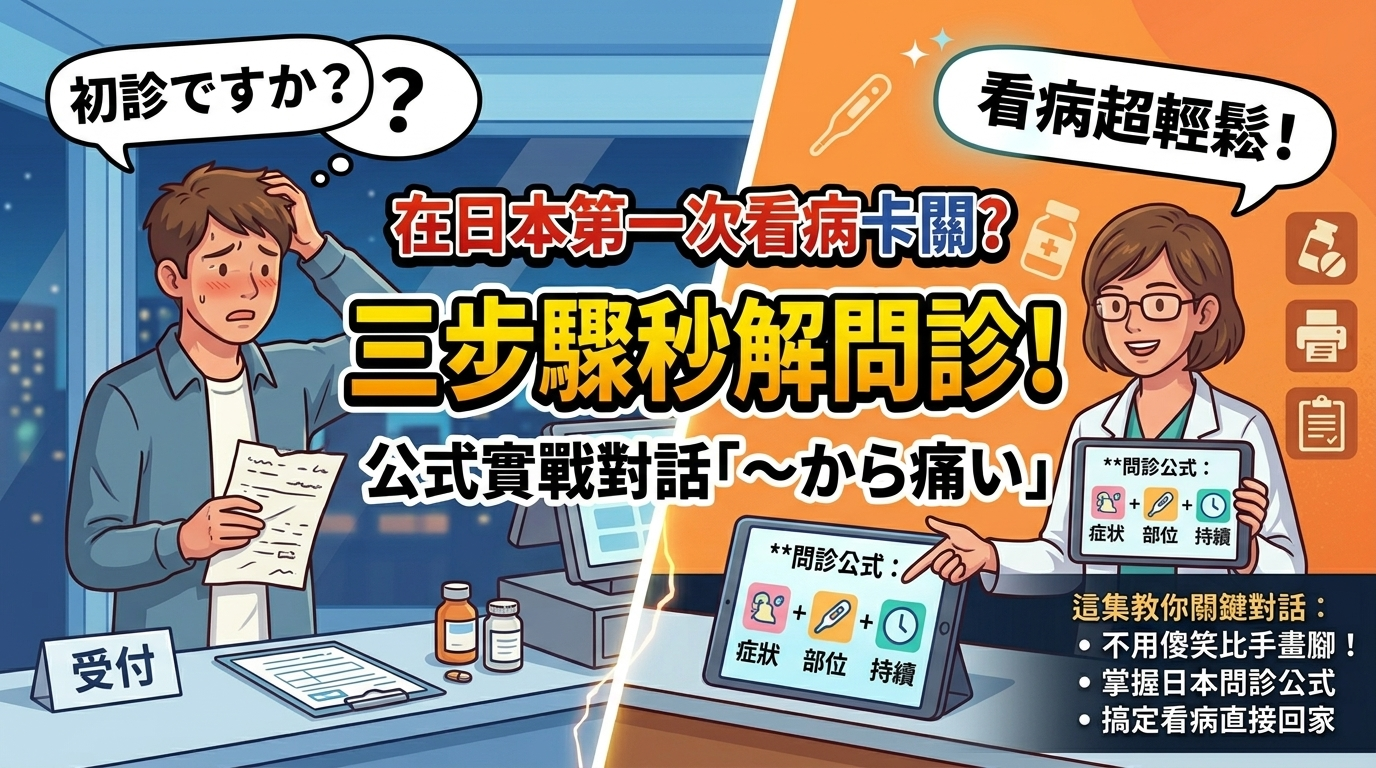 在日本喉嚨痛、發燒,鼓起勇氣走進クリニック。受付一句「初診ですか?」就讓你卡住,好不容易進到診療室,醫師一句「いつから?」更是腦袋一片空白——這就是大多數台灣人在日本第一次看病的真實畫面。