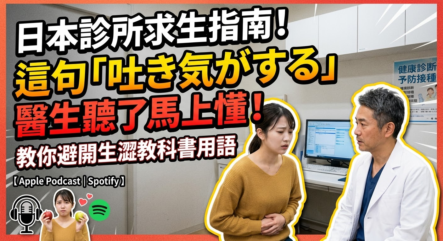 在日本生活最怕的就是突然生病!走進白色的診所,對著醫師要怎麼精準說出「我從前天開始就一直想吐」?為什麼醫生會問你最近都吃什麼?這集我們帶你實習一次日本內科看診流程,教你避開生澀的教科書用語,用最道地的語感跟醫師溝通。