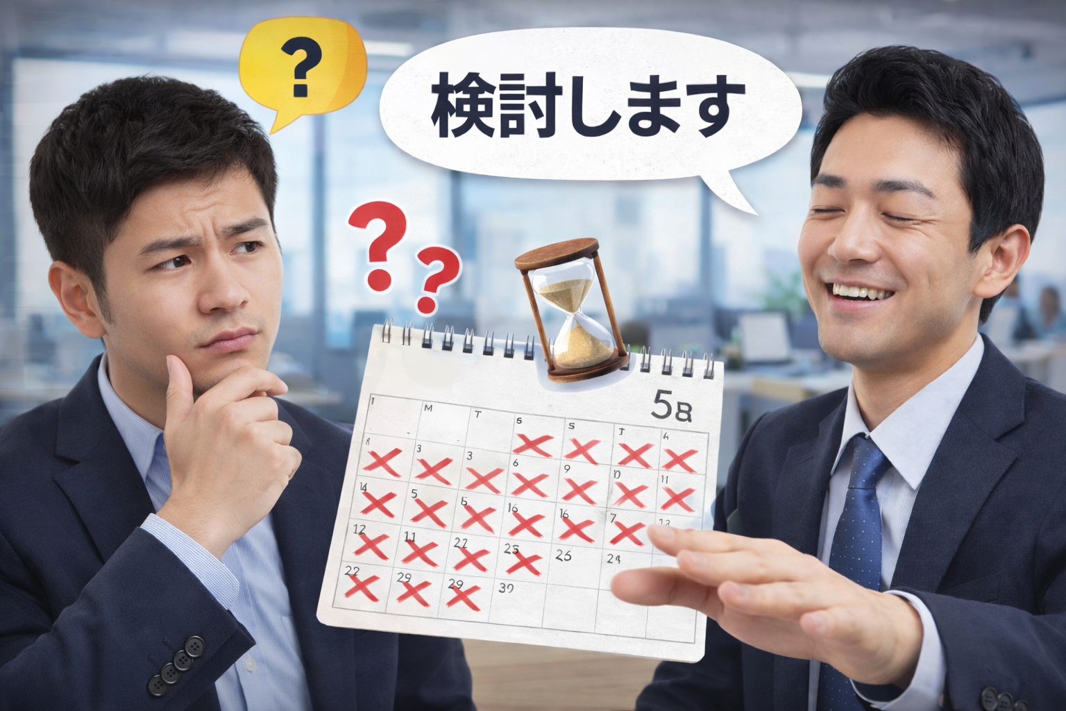 J: 今日のテーマなんですけど、日本人が本当によく使う言葉、「検討します」。